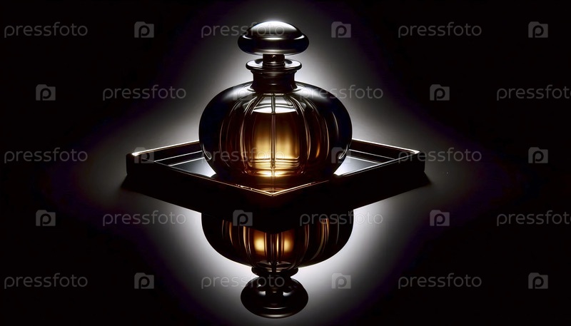 Мокет бутылки с парфюмом из темного копченого стекла на зеркальной подносе, Ai generated image