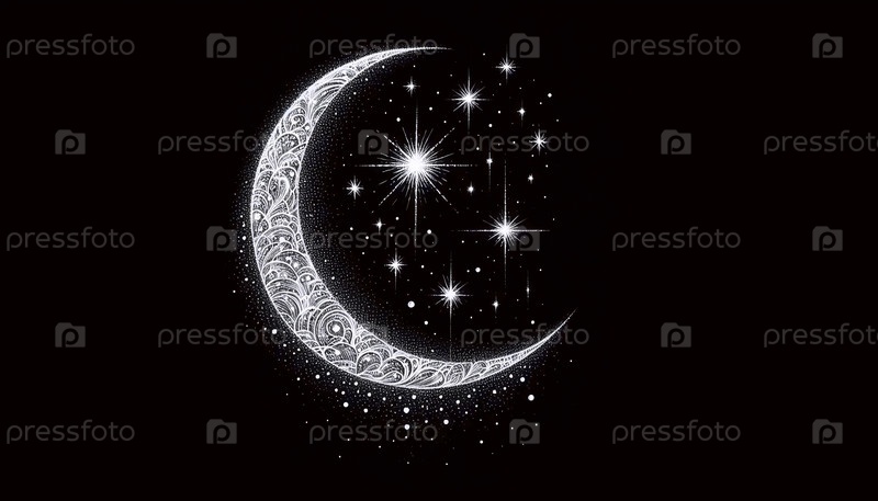 Полумесяц Луна и звезды чернила рисунок художественная печать на черном, Ai generated image