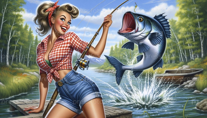 Пин-ап девушка с удочкой, колеблющаяся в большом улове, Ai generated image