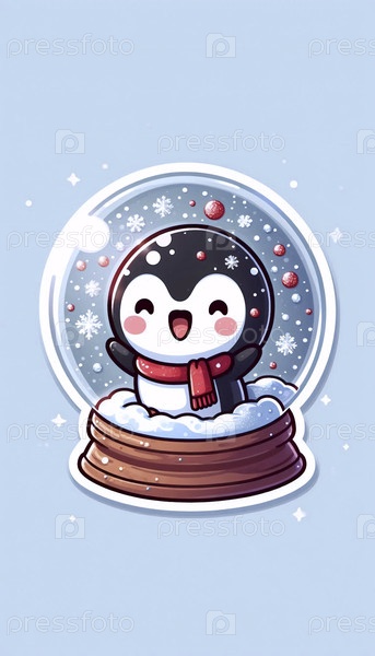 Милый стикер кавайи пингвин в снежном шаре, Ai generated image