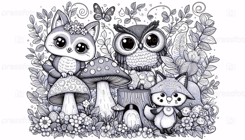 A whimsical kawaii forest цветная страница, Ai generated image