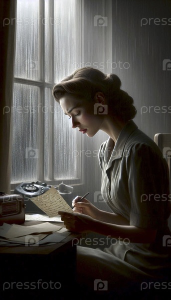 Женщина читает любовное письмо времен войны у окна, Ai generated image