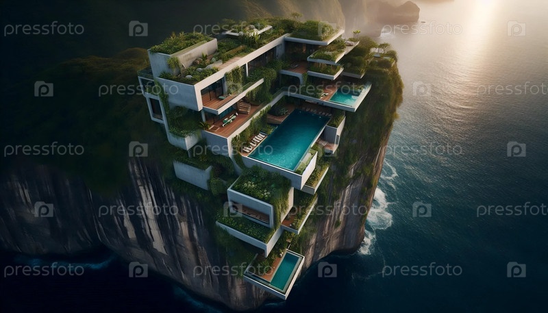 Убежище на обрыве с живыми стенами, Ai generated image