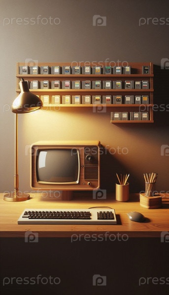 Мокет орехового стола с пустыми пробелами для монитора CRT и винтажной клавиатуры, под полкой с пустыми слотами для картриджей для игр, Ai generated image