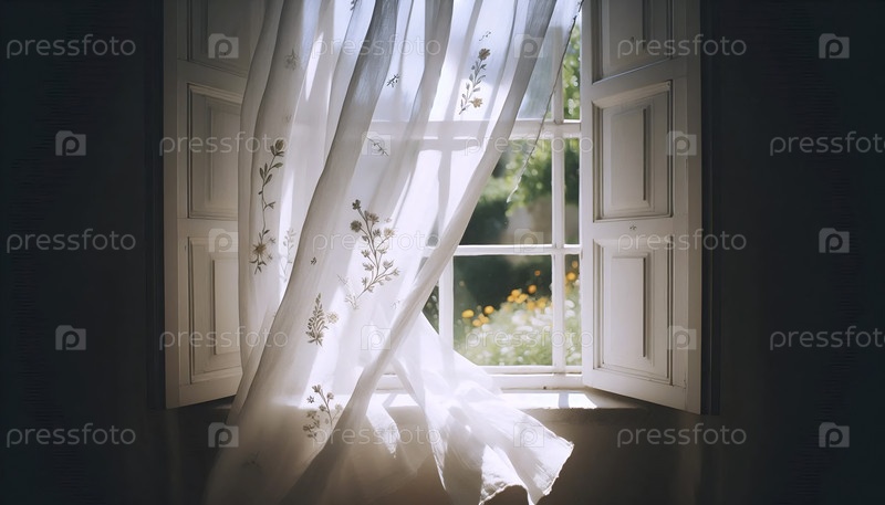 Пара вышитых льняных штор, мягко дующих в ветре от открытого окна, раскрывая солнечный сад, Ай создала изображение