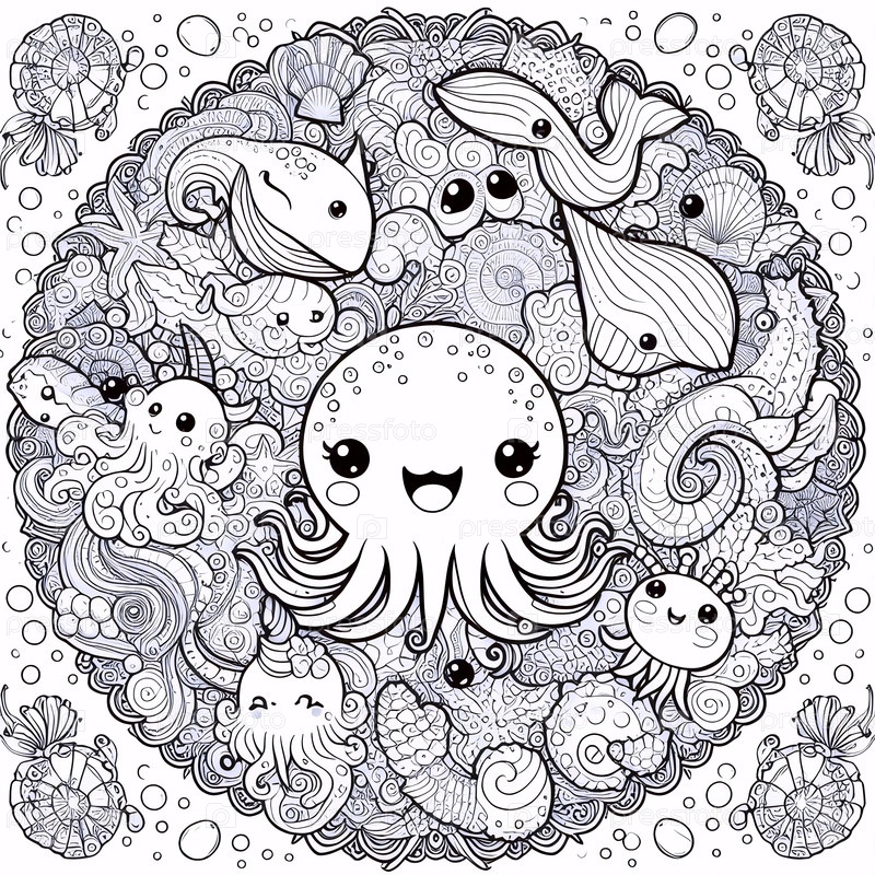 A kawaii ocean creatures цветная страница в круговом формате, Ai generated image