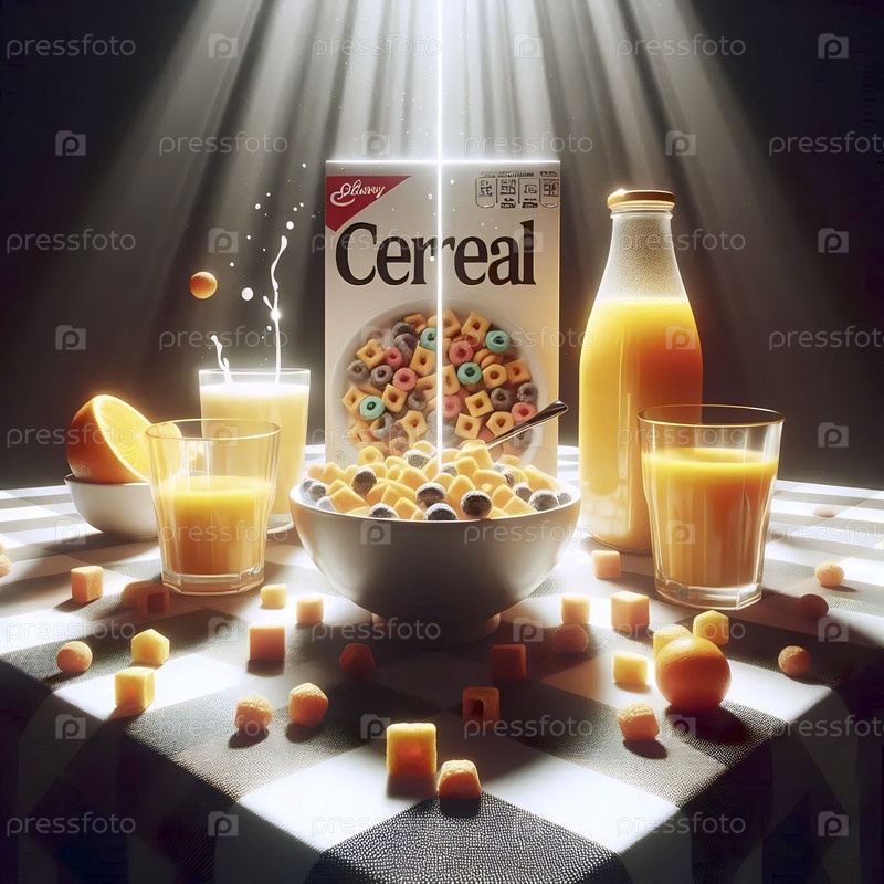 Высоко стилизованный набор завтракового стола с коробкой хлопьев, бокалом апельсинового сока и бутылкой молока, идеально расположенных на квадратной ткани, Ai создал изображение