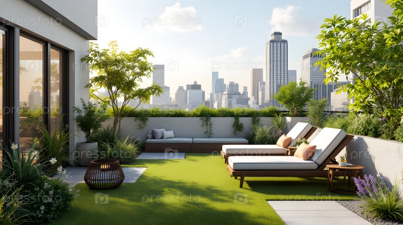 Сад на крыше с креслами, изображение создано с помощью Ai A rooftop garden with lounge chairs
