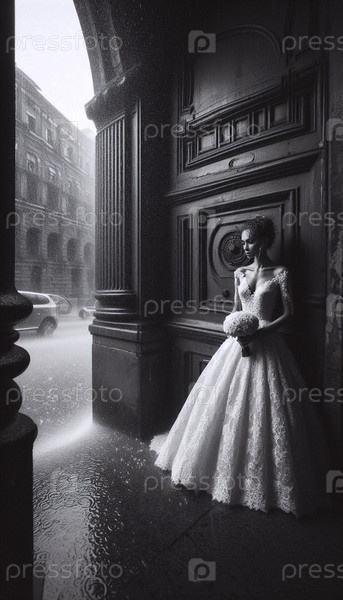 Невеста в пропитанном дождем городском подъезде, Ai generated image