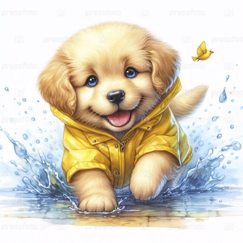 Щенок в дождевом пальто акварельный арт-принт, Ai generated image