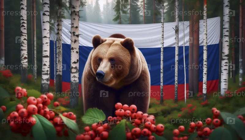 Российский флаг в коричневом медвежонке и лесу тайги, Ai generated image