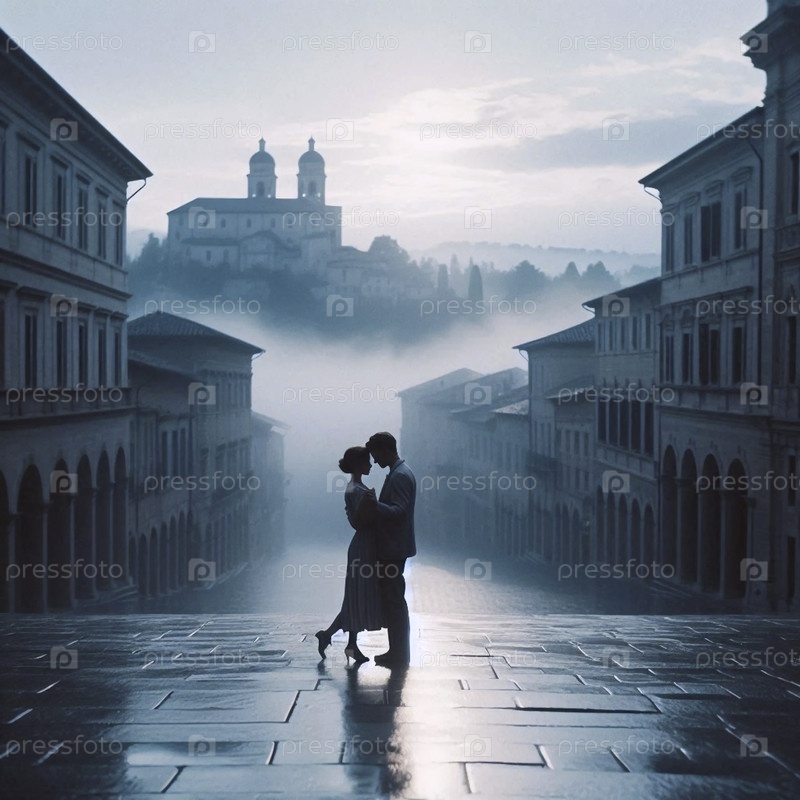 Пара, медленно танцующая посреди асфальтированной площади в небольшом европейском городке, совершенно одна на рассвете, Ai создала изображение