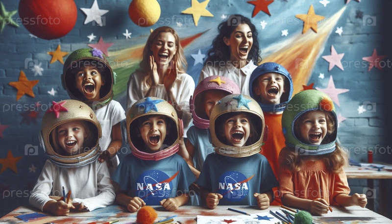 Веселая сцена в космическом лагере для детей, где дети носят картонные шлемы-ракеты и смотрят через гигантский мошеннический телескоп на нарисованную луну, Ai generated image