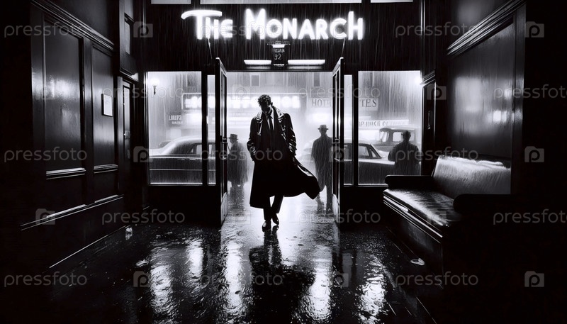Фильм-нуарный снимок мужчины, входящего в вестибюль отеля, Ai generated image
