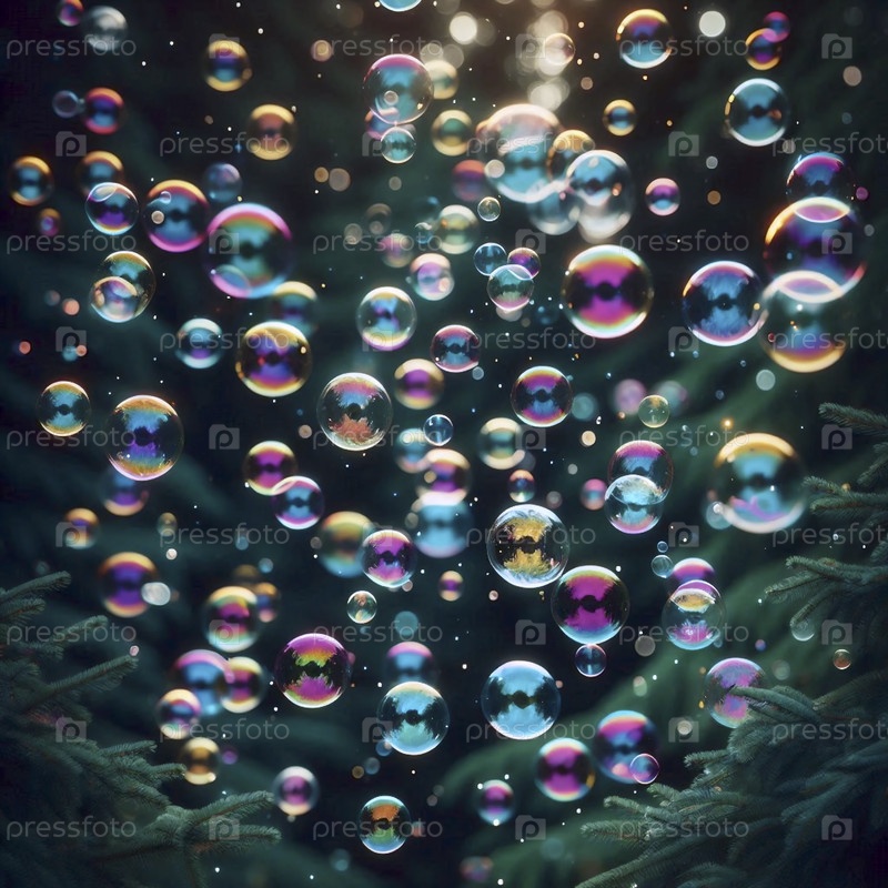 Капризный снимок красочных полупрозрачных мыльных пузырей, плавающих на тёмно-зеленом лесном фоне, Ай создал изображение