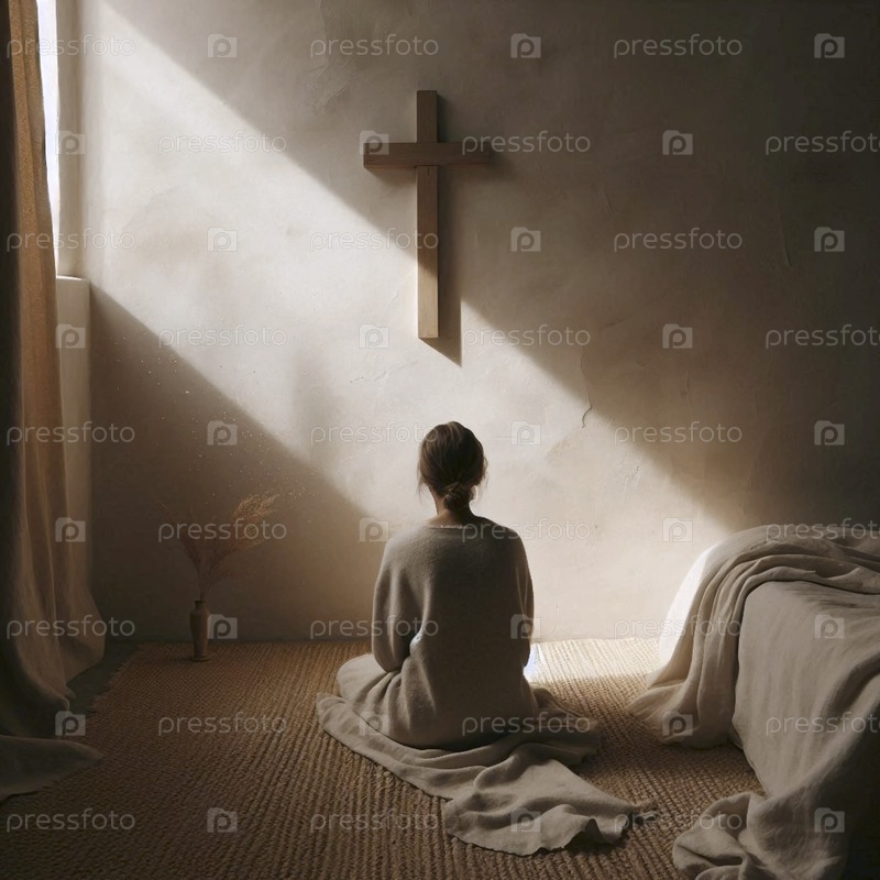 Человек сзади, на коленях перед простым крестом на стене, Ai generated image