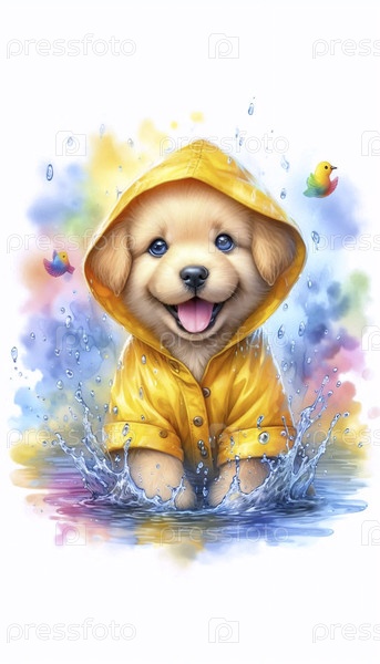 Щенок в дождевом пальто акварельный арт-принт, Ai generated image
