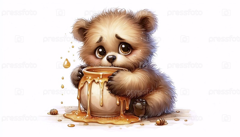 Медвежонок с медовой кастрюлей Акварельный арт-принт, Ai generated image