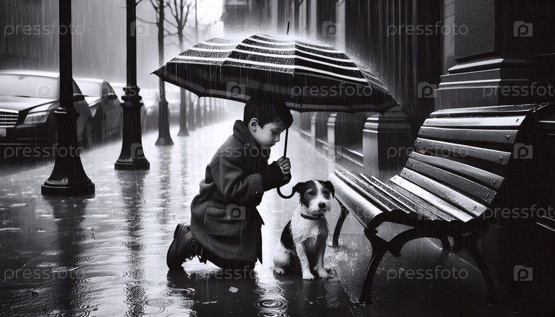 Мальчик, делящий зонтик со своей собакой во время дождя, Ai generated image