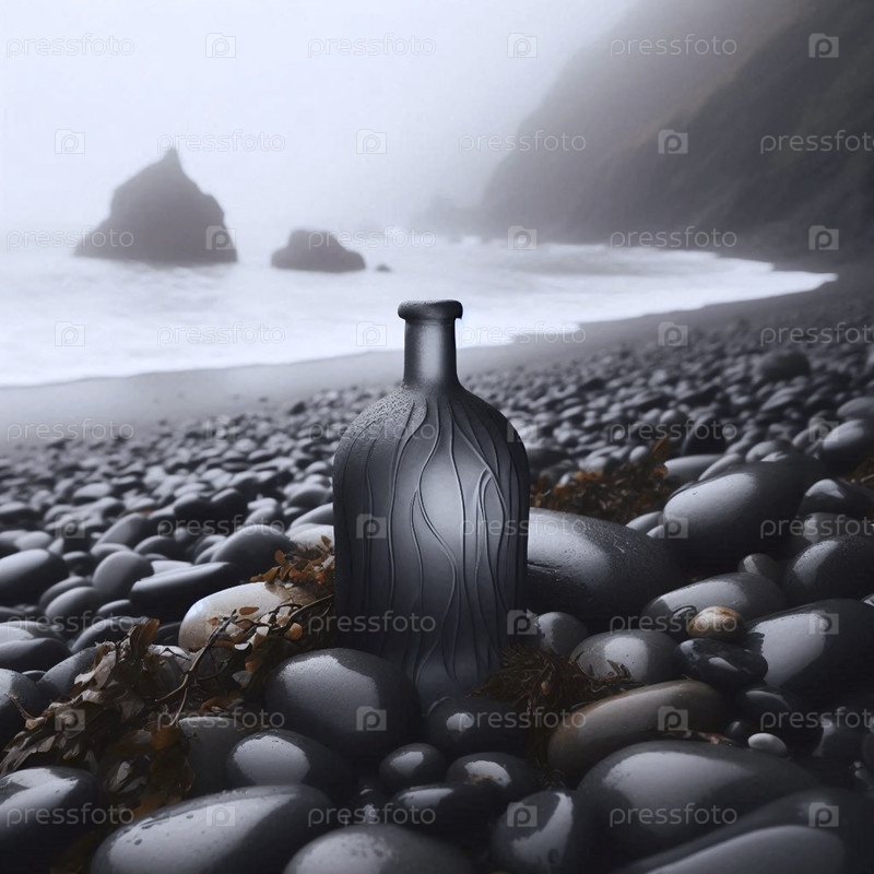 Гладкий макет бутылки в форме речного камня, расположенного среди реальных мокрых камней на туманном изображении Ai