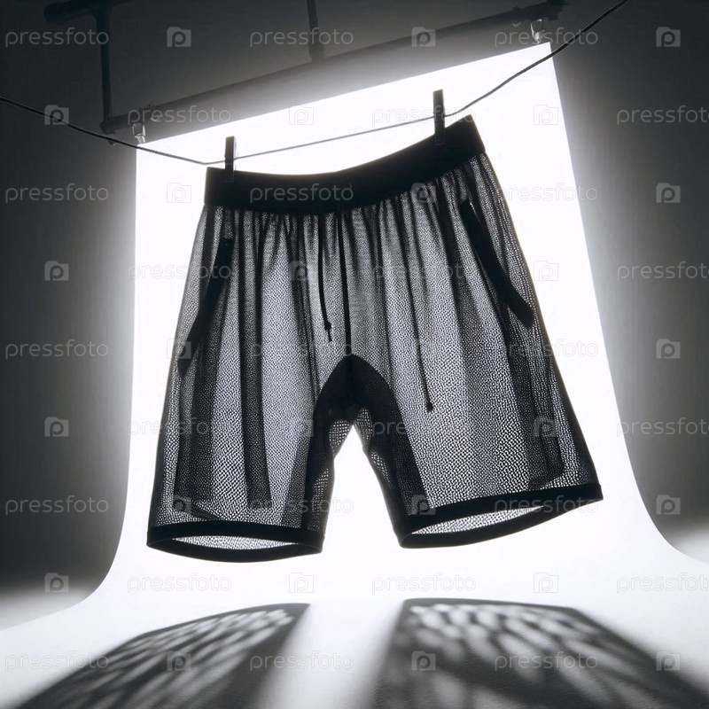 Пара макета спортивных шортов с черной сеткой, подвешенная в воздухе против лайтбокса, Ai generated image