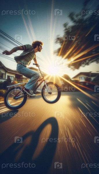 Подросток на велосипеде с банановым сиденьем, захватывающий воздух со обочины в пригородном районе, Ai generated image