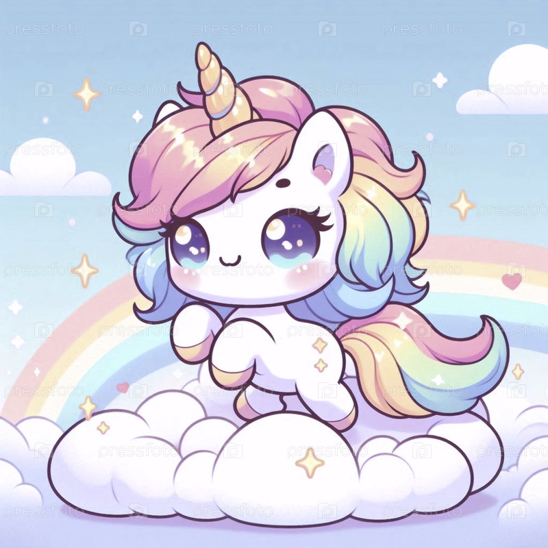 Простой кавайский единорог с радужным гривом, Ai generated image