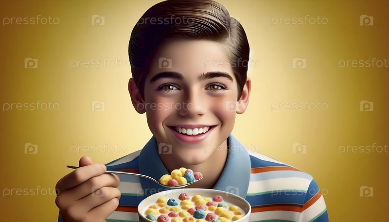 Здоровый портрет персикового мальчика с аккуратной стрижкой, ярко улыбающегося в то время как он наслаждается миской красочных хлопьев на завтрак, Ai generated image