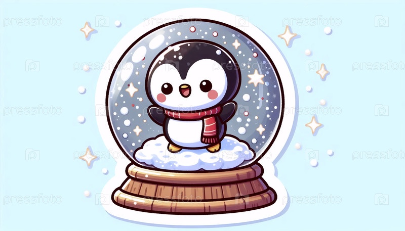 Милый стикер кавайи пингвин в снежном шаре, Ai generated image