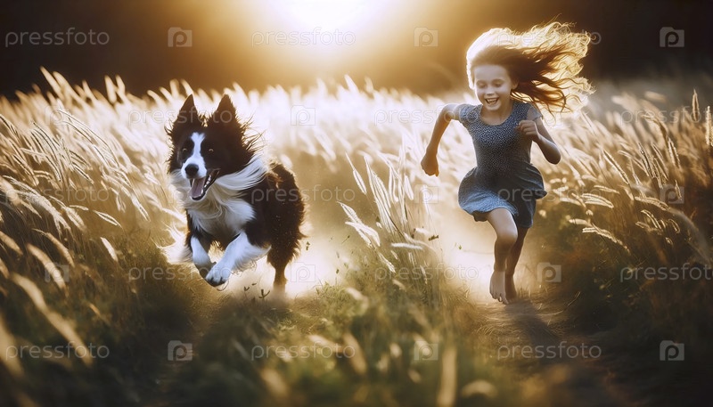 Девочка, бегущая с собакой через поле высокой травы, Ai generated image