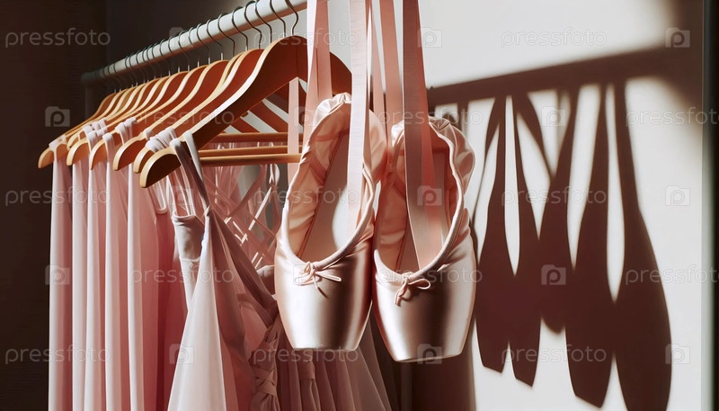 Шелковые балетные тапочки висят на стойке для костюмов, Ai generated image