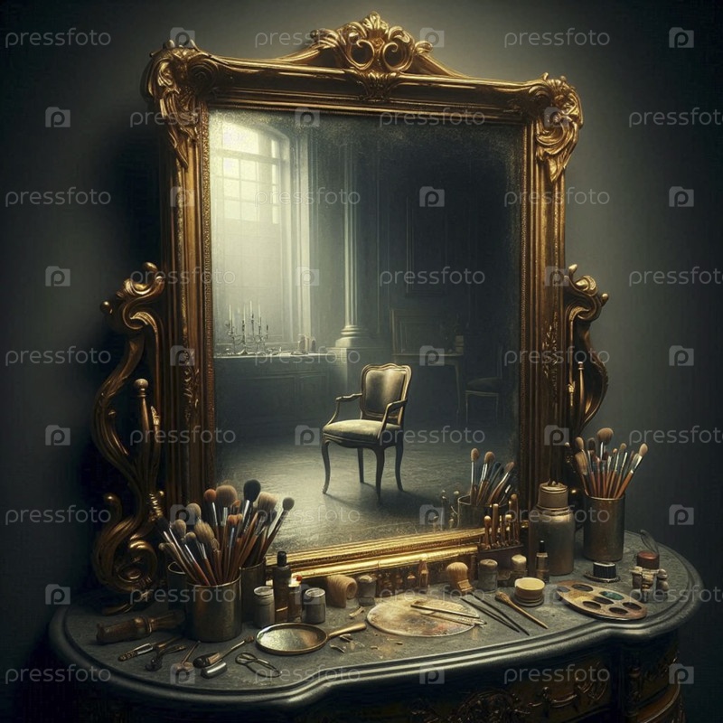 Более широкий снимок, включающий пыльное зеркало, отражающее пустой стул, Ai generated image