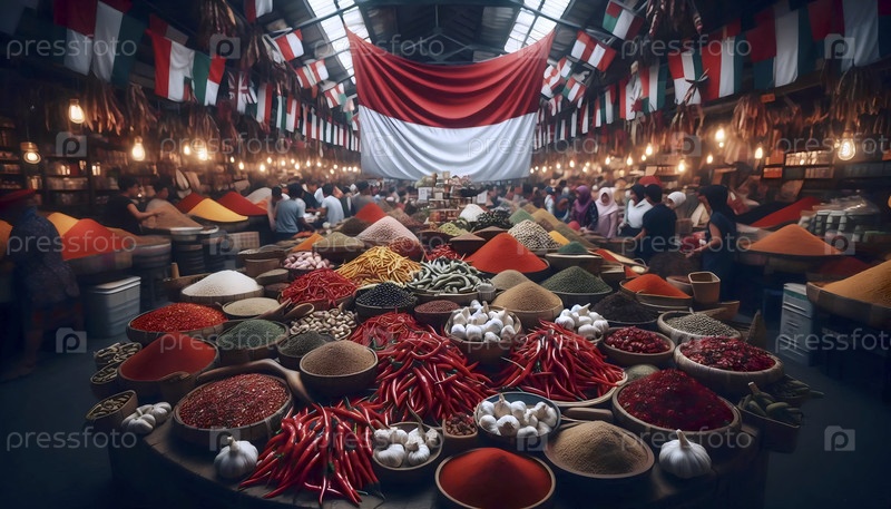 Индонезийский флаг в изобилии на рынке пряностей, Ai generated image