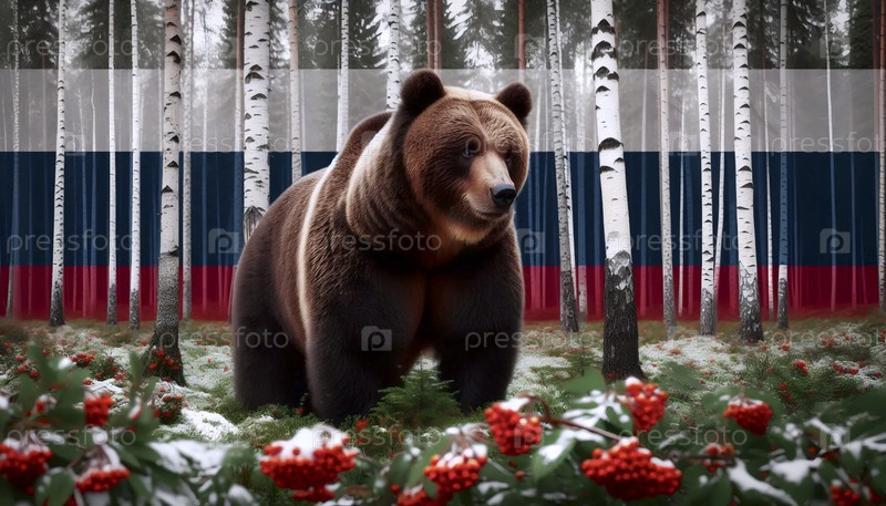 Российский флаг в коричневом медвежонке и лесу тайги, Ai generated image