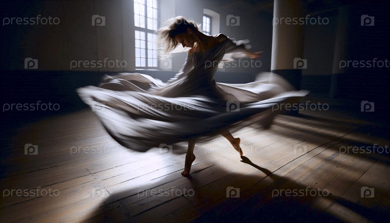 Танцовщица, захваченная в размытом, выразительном вращении в жесткой пустой репетиционной студии, Ai generated image