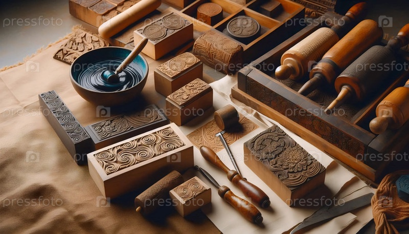 Инструменты печати на деревянном блоке, Ai generated image