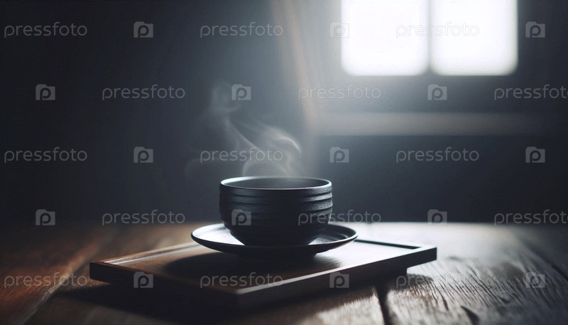 Черный фарфоровый кофеварка и макет тарелки на темноокрашенном дубовом столе, Ai generated image