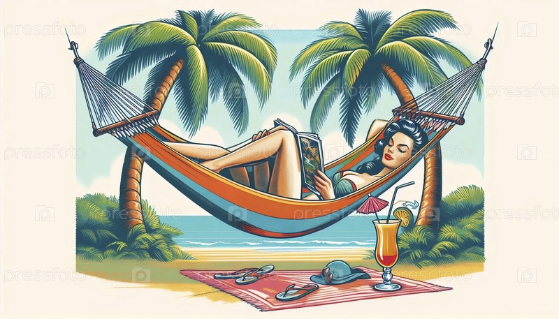 Пин-ап девушка в гамаке между двумя пальмовыми деревьями, читает журнал, Ai generated image