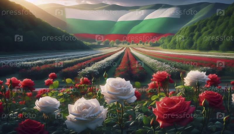 Болгарский флаг в розовой долине урожая, Ai generated image