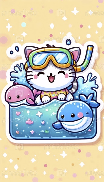 Милый наклейка кота, носящего шнорхель с китами, Ai generated image