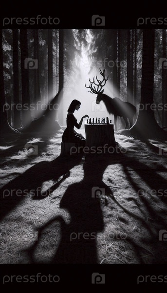 Игра в шахматы с тенью лесных духов, Ai generated image
