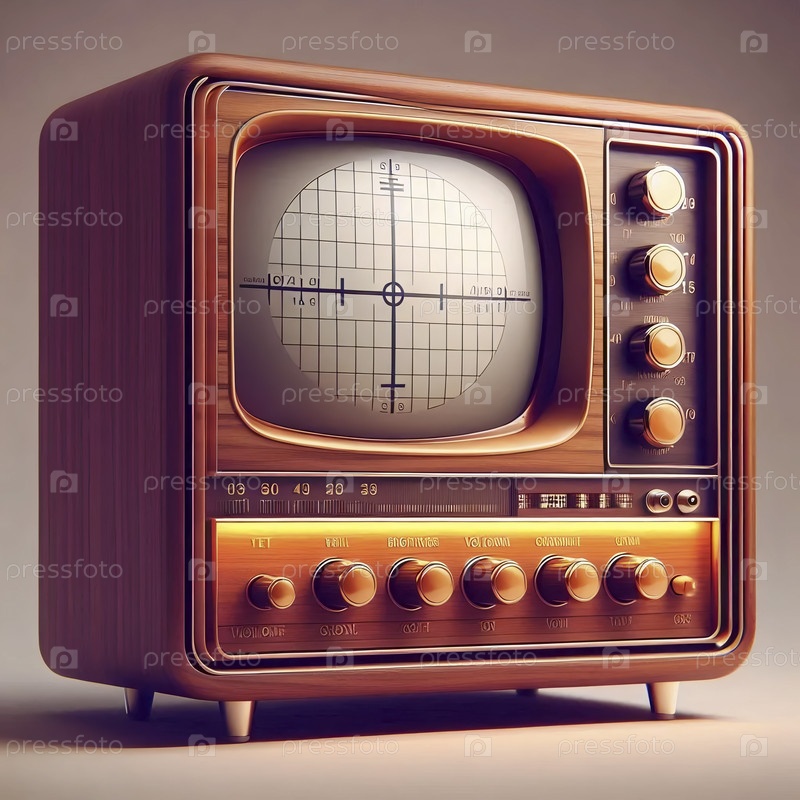 Телевизор из деревянных панелей с большим, выпуклым зеленым экраном и рядами аналоговых циферблат Ai генерирует изображение