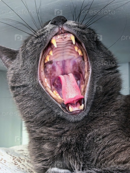 Серая кошка зевает с открытым ртом и видимыми зубами