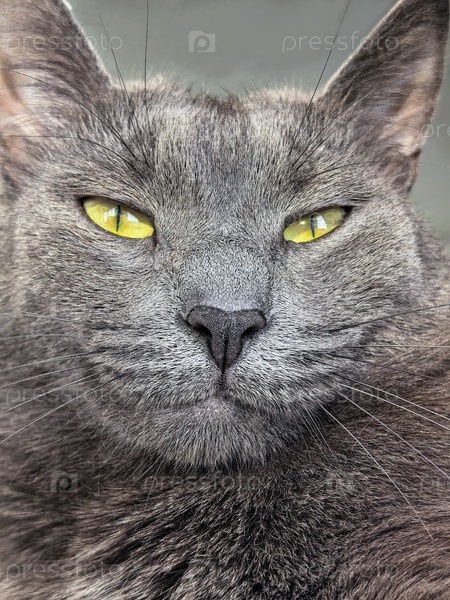 Ближайшее изображение серой кошки с интенсивными желтыми глазами, расслабляющейся
