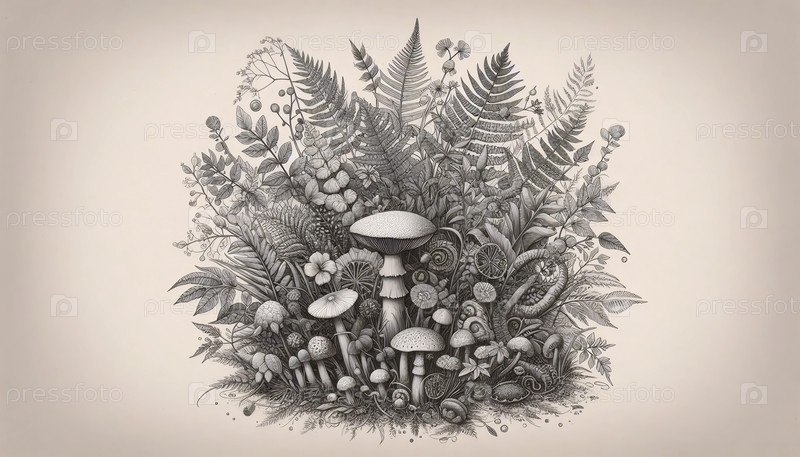 Ботаническая иллюстрация лесного ландшафта, Ai generated image