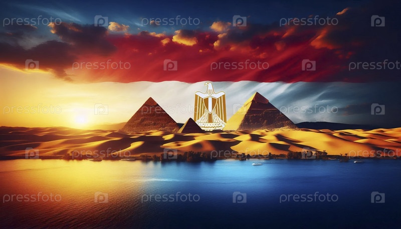Египетский флаг в древней пирамиде пустынный ландшафт, Ai generated image