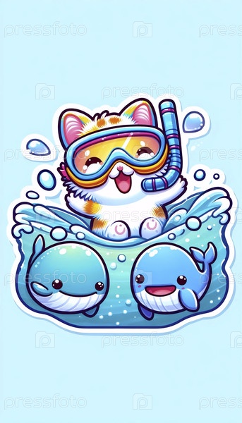 Милый наклейка кота, носящего шнорхель с китами, Ai generated image