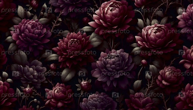 Темно-капризный цветочный бесшовный рисунок с сливовыми и бургундскими цветами на черном, Ai generated image