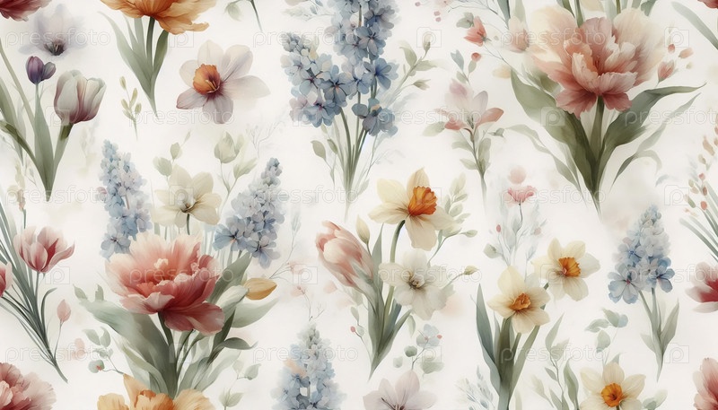 Нежный акварельный цвет цветов для весны производит бесшовные узоры, Ai generated image