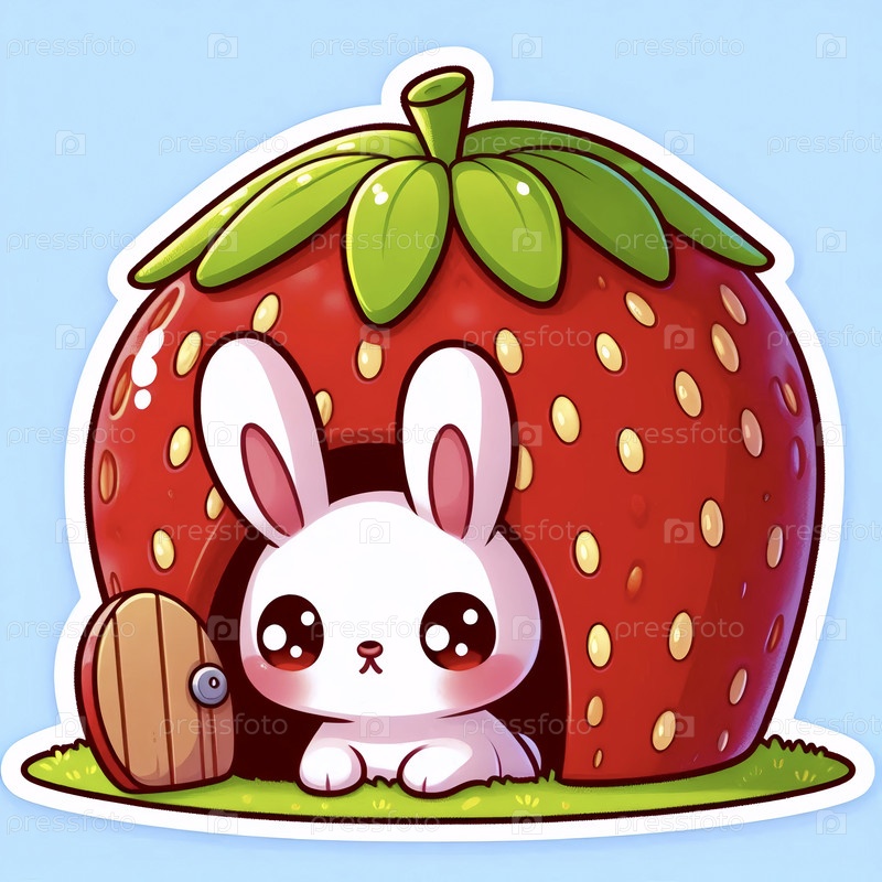Милый стикер кавайи с кроликом в клубничном доме, Ai generated image
